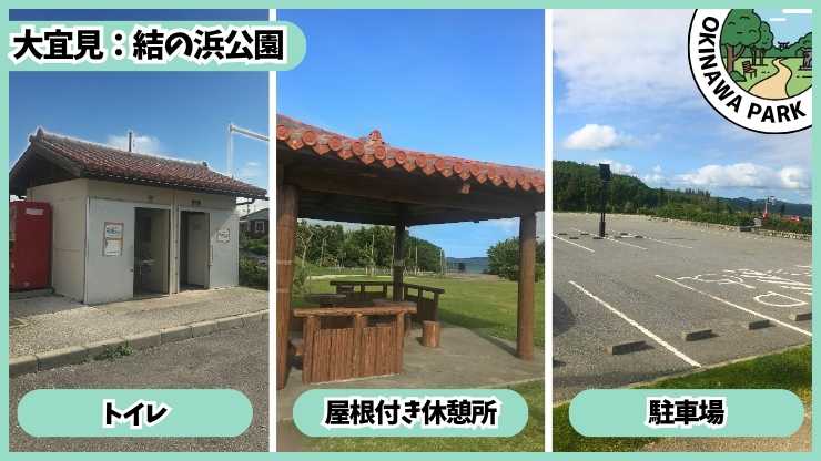 結の浜公園:トイレ、屋根付き休憩所、駐車場